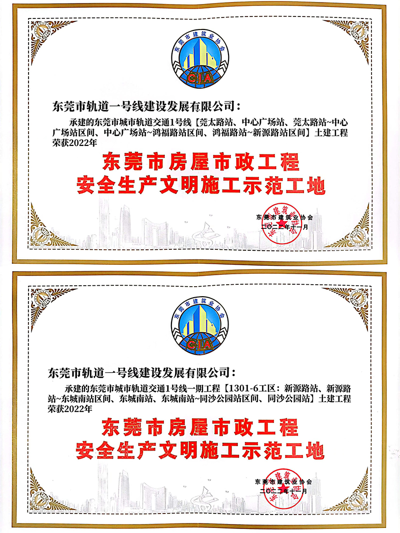 2022年11月,東莞市建筑業(yè)協(xié)會授予軌道一號線公司“東莞市房屋市政工程安全生產(chǎn)文明施工示范工地”榮譽(yù)稱號