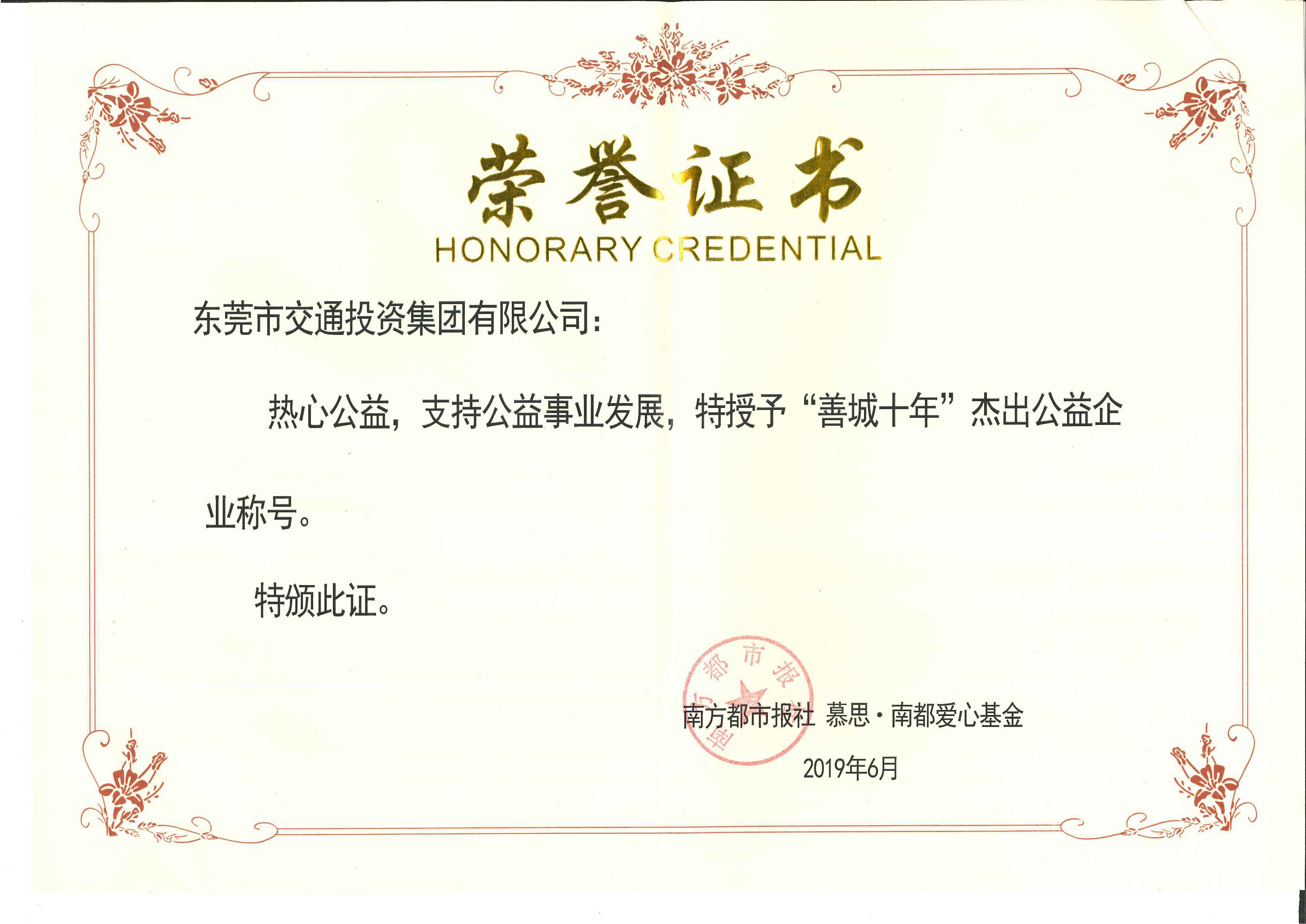 2019年6月,東莞市交通投資集團(tuán)有限公司榮獲“善城十年”杰出公益企業(yè)稱號(hào)。