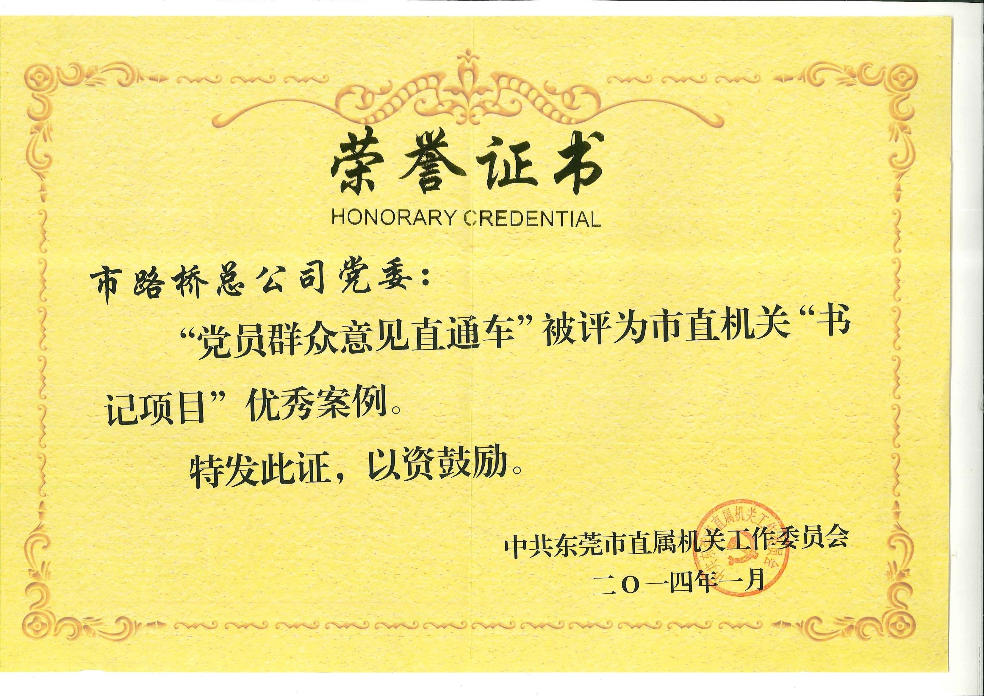 2014年1月30日,市路橋總黨委在“黨員群眾意見(jiàn)直通車”被評(píng)為市直機(jī)關(guān)“書記項(xiàng)目”優(yōu)秀案例。