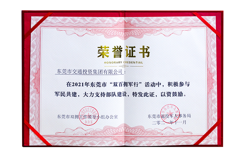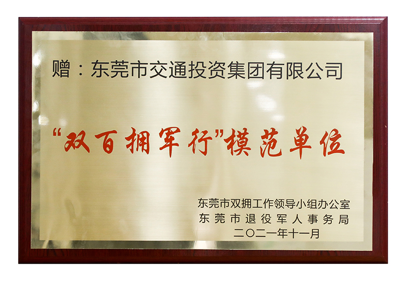 2021年11月,東莞交投集團(tuán)獲“雙百擁軍行”模范單位(證書)