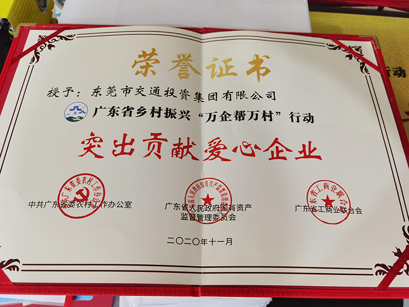 2020年市交投集團(tuán)榮獲“廣東省鄉(xiāng)村振興‘萬(wàn)企幫萬(wàn)村’行動(dòng)突出貢獻(xiàn)愛(ài)心企業(yè)”稱號(hào)