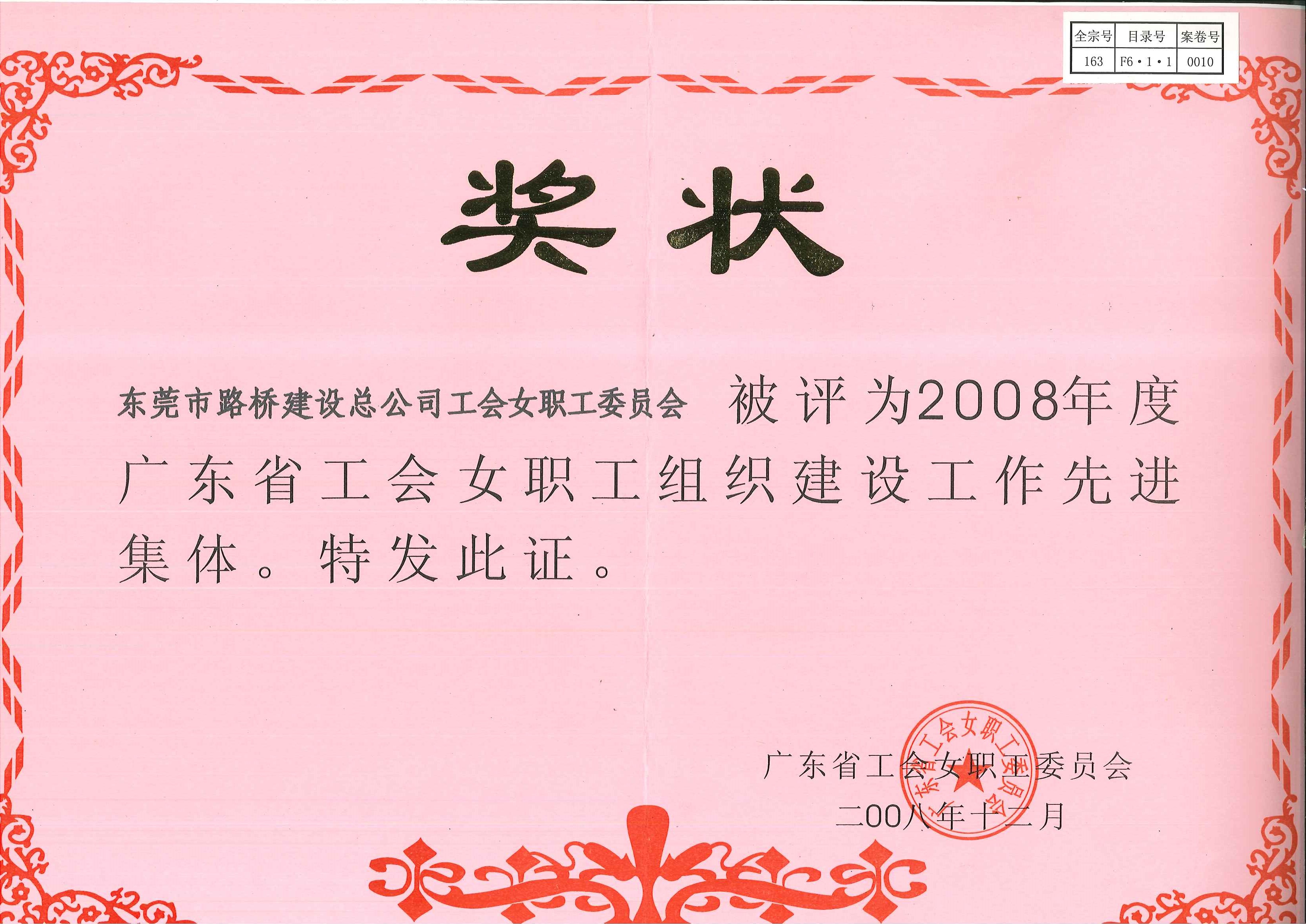 2008年12月24日,市路橋總工會(huì)女職工委員會(huì)被評(píng)為“2008年度廣東省工會(huì)女職工組織建設(shè)工作先進(jìn)集體”。