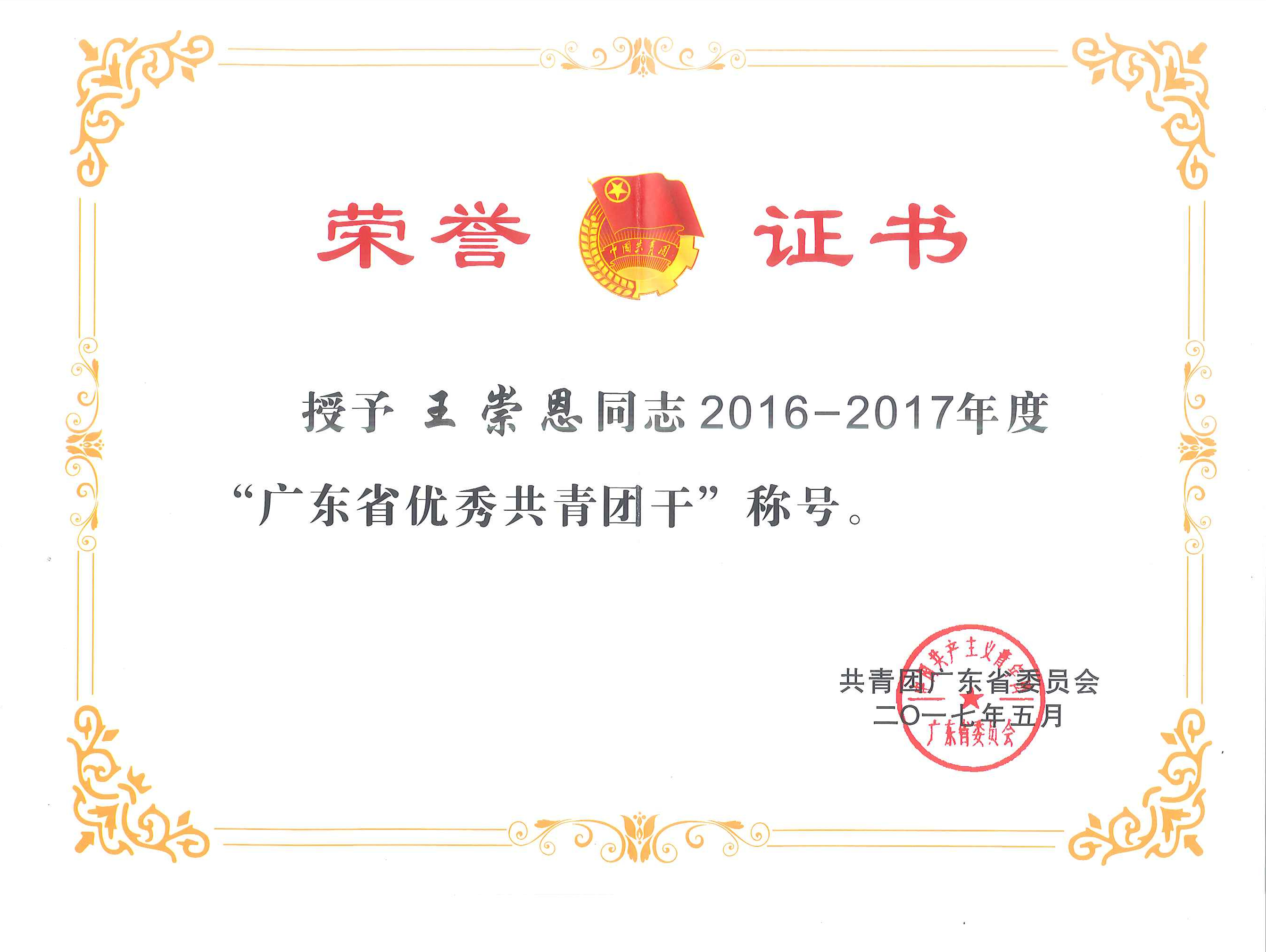 2017年5月,團省委向東莞巴士公司王崇恩授予2016-2017年度“廣東省優(yōu)秀共青團干”稱號。