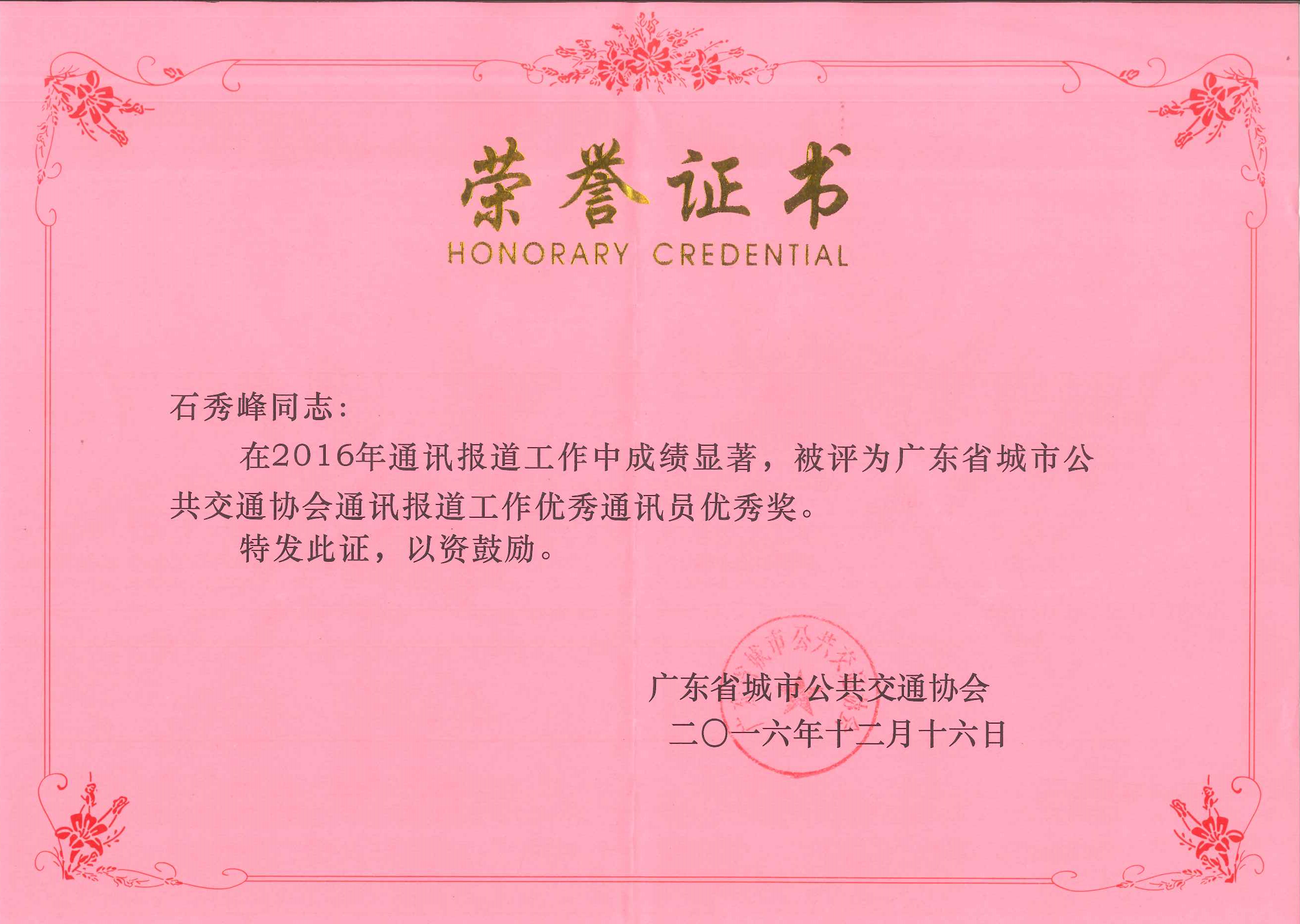 2016年12月,東莞巴士公司石秀峰被評為廣東省城市公共交通協(xié)會通訊報道工作優(yōu)秀通訊員優(yōu)秀獎。
