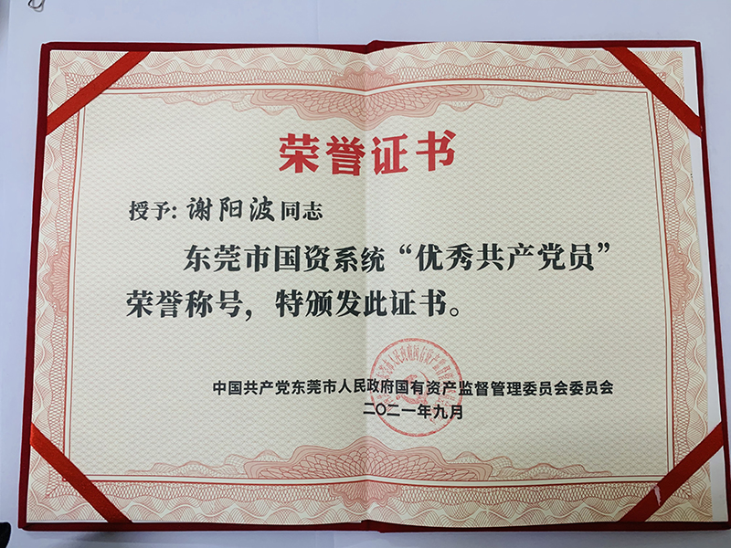 2021年9月1日,東莞控股公司謝陽波獲得東莞市國資系統(tǒng)“優(yōu)秀共產(chǎn)黨員”榮譽稱號