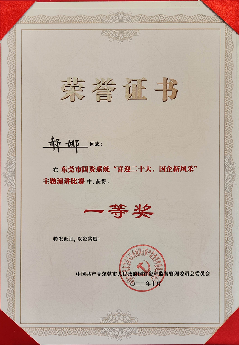 2022年10月,東莞控股公司郝娜獲得東莞市國資系統(tǒng)“喜迎二十大,國企新風(fēng)采”主題演講比賽一等獎