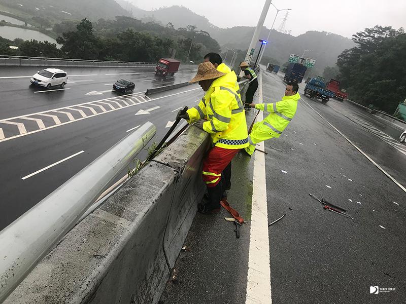 ?;⒎止九c經(jīng)緯公司在“山竹”臺風后全力搶修路面受損設施
