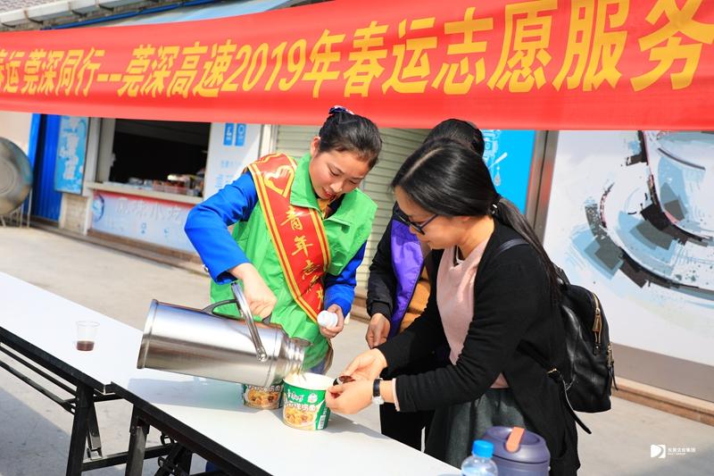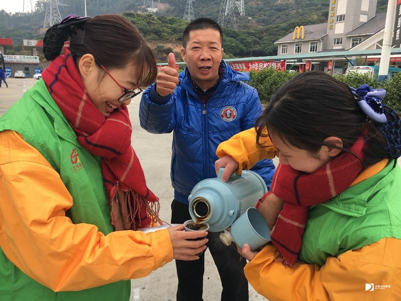 春運期間,為途徑服務區(qū)的旅客送上熱開水