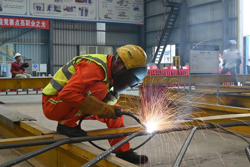 緊接著,來自中鐵十二局、中鐵十一局、中鐵大橋局、保利長大等施工單位的焊接高手們輪番上陣。他們?nèi)蔽溲b,手持焊槍,神情專注。一時間,作業(yè)區(qū)內(nèi)弧光閃爍、焊花璀璨,選手們沉穩(wěn)操作,盡顯精湛技藝與嚴謹態(tài)度。